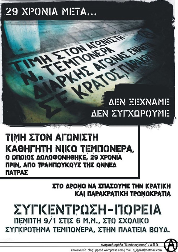 Δεν ξεχνάμε-δεν συγχωρούμε τη δολοφονία του αγωνιστή Νίκου Τεμπονέρα. Συγκέντρωση-Πορεία την Πέμπτη 9 Γενάρη στις 6 μ.μ.
