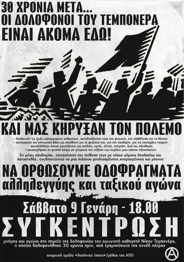 ΣΑΒΒΑΤΟ 9 ΓΕΝΑΡΗ, 18.00 ΣΥΓΚΕΝΤΡΩΣΗ μνήμης και αγώνα στο σημείο της δολοφονίας του αγωνιστή καθηγητή Νίκου Τεμπονέρα, ο οποίος δολοφονήθηκε 30 χρόνια πριν, από τραμπούκους της οννέδ Πάτρας