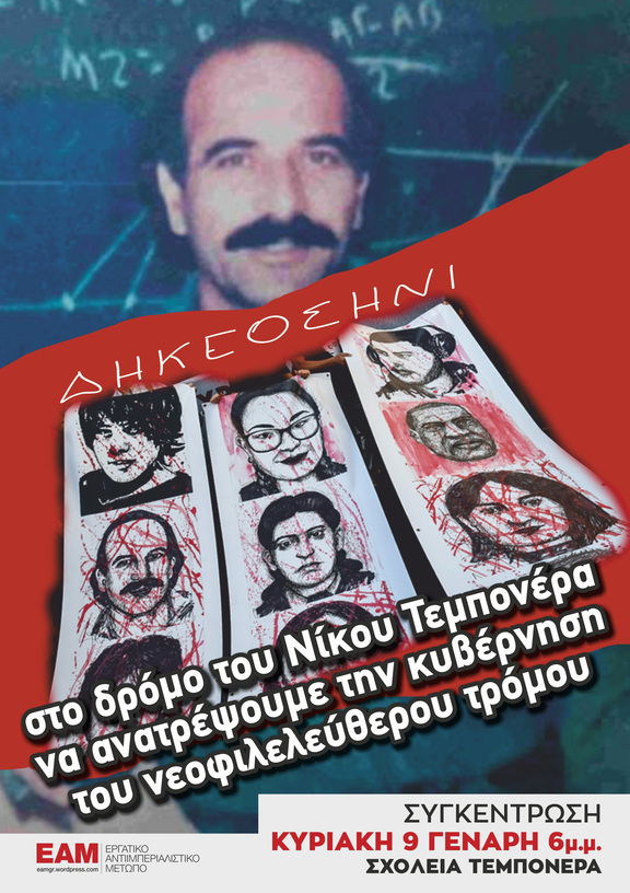 Νίκο Τεμπονέρα θα είμαστε και φέτος εκει την Κυριακή 9Γενάρη στις 6μ.μ. στο τόπο της θυσίας σου, οι σύντροφοι σου, η οικογένεια σου, οι συνάδελφοι σου, οι φίλοι σου, οι νέοι και οι νέες, όσοι κάναμε την μνήμη θεμέλιο ανασύνταξης της κοινωνίας για να μπορεί να ελπίζει σε ένα μέλλον δικαιοσύνης και κοινωνικής απελευθέρωσης.