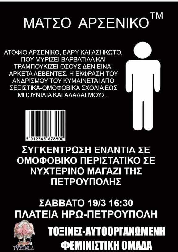 Με αφορμή ομοφοβική επίθεση πριν λίγους μήνες από μπράβο γνωστού club στην Πετρούπολη το Σάββατο 19/03 κι ώρα 16.30 στην πλατεία Ηρώ καλούμε ατομικότητες και συλλογικότητες σε μικροφωνική συγκέντρωση ενάντια σε μπραβιλίκια, εκφοβισμό, ομο/τρανσφοβικές συμπεριφορές και οποιαδήποτε μορφή έμφυλης καταπίεσης στις γειτονιές μας.