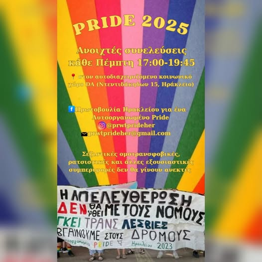 Ανοιχτές συνελεύσεις της Πρωτοβουλίας Ηρακλείου για ενα αυτοοργανωμένο Pride κάθε Πέμπτη 17:00-19:45 στον αυτοδιαχειριζόμενο κοινωνικό χώρο DA! (