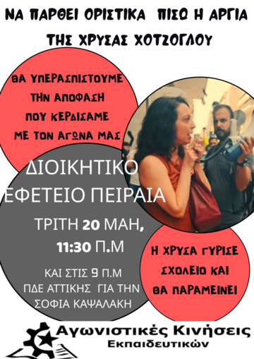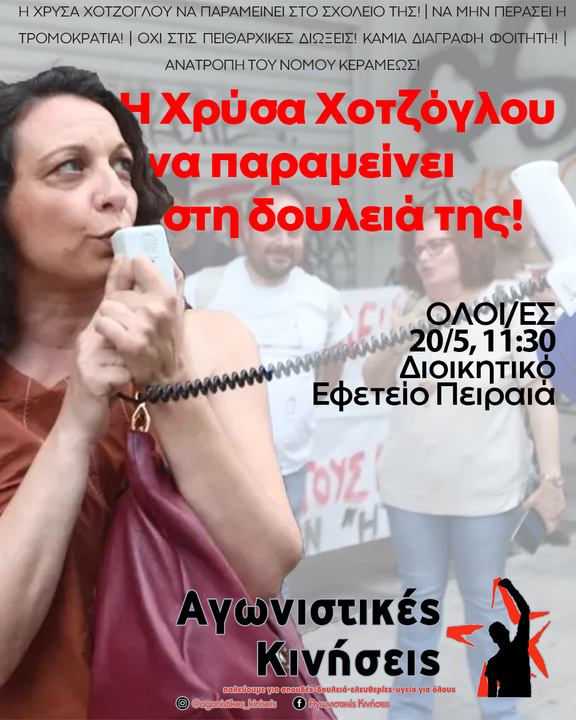 ΑΓΩΝΙΣΤΙΚΕΣ ΚΙΝΗΣΕΙΣ | Η Χρύσα Χοτζόγλου να παραμείνει στη δουλειά της! | Όλοι και όλες στις 20/05, στις 11:30 στο Διοικητικό Εφετείο Πειραιά!