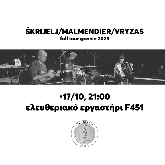 Το τρίο Škrijelj /Malmendier/ Vryzas, δημιουργήθηκε το 2023 στην Γαλλία. Έκτοτε οι 3 αυτοσχεδιαστές/ριες έχουν πραγματοποιήσει πληθώρα συναυλιών σε σκηνές πειραματικής μουσικής αλλά και σε διεθνή φεστιβάλ στην Ευρώπη. Ο ήχος τους χαρακτηρίζεται από έναν ζωντανό διάλογο μεταξύ ακουστικού και ηλεκτρονικού, όπου οι παραδοσιακές τεχνικές αλληλεπικαλύπτονται και μετασχηματίζονται σε νέες υφές, σύνολα και εντάσεις.