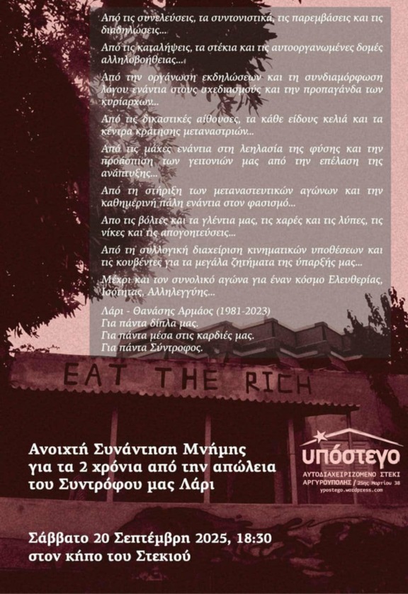 Ανοιχτή Συνάντηση Μνήμης για τα 2 χρόνια από την απώλεια του Συντρόφου μας Λάρι, Σάββατο 20 Σεπτέμβρη 2025, 18:30 στο κήπο του Υποστέγου