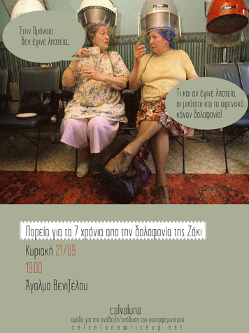 Έχουν περάσει 7 χρόνια από τη δολοφονία του Ζακ ή καλύτερα από το λιντσάρισμά μέχρι θανάτου του στην Ομόνοια. Δύο νοικοκυραίοι καταστηματάρχες, που φέραν βαρέως το αίσθημα της ιδιοκτησίας ξυλοκόπησαν την Zackie που βρισκόταν σε κατάσταση πανικού, πάντα φυσικά, με τη συμβολή των φερέφωνων του κράτους, τους μπάτσους αφήνοντάς την σε ημιθανή κατάσταση στο κέντρο της Αθήνας. Ο άγριος ξυλοδαρμός και η βίαιη προσαγωγή της Zackie διαδραματίστηκε μπροστά στα μάτια φιλήσυχων πολιτών, που μάλλον η συνήθεια στη σιωπή και στην απραγία τους έκανε συνένοχους, βάζοντας κι αυτοί με τη σειρά τους το λιθαράκι τους στο ψηφιδωτό της σιωπής και της σήψης.