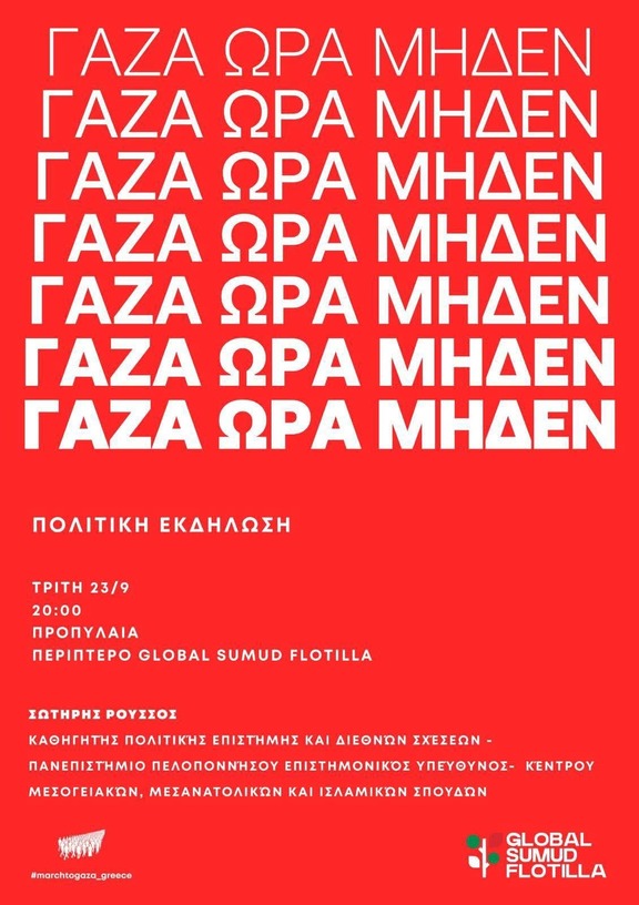 👉🏻Σε μια συγκυρία όπου η Γάζα σβήνεται από τον χάρτη με βόμβες και λιμό, την ίδια στιγμή που οι περιφερειακές ισορροπίες στη Μέση Ανατολή αλλάζουν δραματικά, διοργανώνουμε μια πολιτική εκδήλωση με τίτλο «Γάζα, Ώρα Μηδέν», με προσκεκλημένο τον Σωτήρη Ρούσσο, καθηγητή Πολιτικής Επιστήμης και Διεθνών Σχέσεων στο Πανεπιστήμιο Πελοποννήσου και επιστημονικό υπεύθυνο του Κέντρου Μεσογειακών, Μεσανατολικών και Ισλαμικών Σπουδών.
