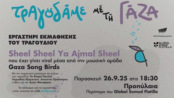 Την Παρασκευή 26.9.25 στις 18:30 στο Περίπτερο του Global Sumud Flotilla στα Προπύλαια θα πραγματοποιηθεί ένα εργαστήριο για να μάθουμε όλ@ μαζί το τραγούδι Sheel Sheel Ya Ajmal Sheel που ταξιδεύει σε όλο τον κόσμο από τη Γάζα.
