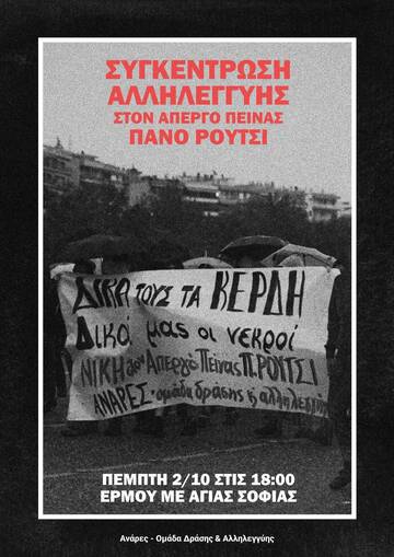 Τα παραδείγματα βαρβαρότητας είναι αμέτρητα για να θεωρήσουμε πως η συγκάλυψη του εγκληματος των Τεμπων, τα "σκάνδαλα" που κάθε λίγο αποκαλύπτονται, η εμπλοκή σε πολεμικά μέτωπα με την ενεργή στήριξη της γενοκτονίας των Παλαιστινίων και οι χιλιάδες δολοφονίες μεταναστριών στα κάτεργα, στα σύνορα και στο Αιγαίο είναι εξαιρέσεις. Το ελληνικό κράτος συγκροτείται γύρω από την εκμετάλλευση και την εξόντωση ανθρώπων της τάξης μας, αποδεικνύοντας πως οι ζωές μας έχουν αξία μόνο ως πηγές παραγωγικότητας και κερδοφορίας. Ωστόσο,ο αγώνας των συγγενών των θυμάτων τα τελευταία δύο χρόνια είναι αδιάληπτος παρά την προσπάθεια φίμωσης τους και ατίμωσης των νεκρών τους. Από τις 14 Σεπτέμβρη ο Πάνος Ρούτσι, πατέρας του θύματος των Τεμπών Ντένις, κάνει απεργία πείνας μετά την άρνηση εκταφής και εξέτασης της σωρού του γιου του, με αίτημα την έρευνα των πραγματικών αιτιών θανάτου του.