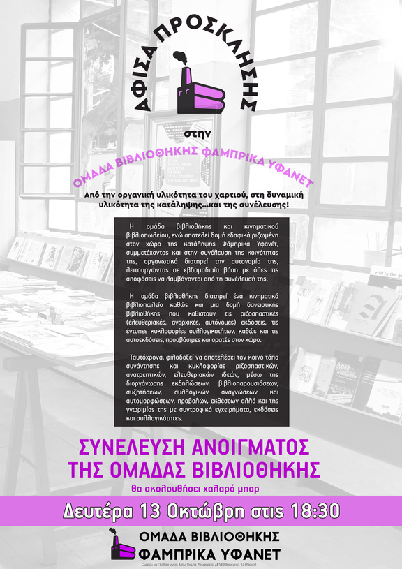 Πρόσκληση-Κάλεσμα σε συνέλευση ανοίγματος της Ομάδας Βιβλιοθήκης Φάμπρικα Υφανέτ