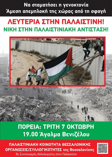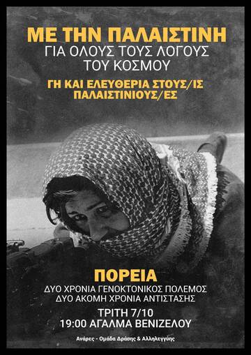 ΤΡΙΤΗ 7/10: Μεγάλη Διαδήλωση. 2 χρόνια από την έναρξη του πολέμου στη Γάζα! 19.00 Άγαλμα Βενιζέλου.