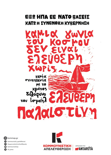 Η κυβέρνηση της ΝΔ, έχοντας απογειώσει την πολιτική των προηγούμενων κυβερνήσεων, προσφέρει κάθε δυνατή διευκόλυνση, στους φονιάδες των ΗΠΑ - ΝΑΤΟ και στο ίδιο το Ισραήλ. Βάζει πλάτη στην σφαγή! Τα συστημικά ΜΜΕ κρύβουν την αλήθεια. Τα λιμάνια, οι μεγάλες εταιρίες, οι στρατοί, καθημερινά συνεργάζονται σε κάθε επίπεδο με το Ισραήλ. Πρόσφατα η ελληνική κυβέρνηση πούλησε το 100% της ΕΛΒΟ (ελληνική στρατιωτική βιομηχανία οχημάτων) στην Ισραηλινή SKGroup που συνεργάζεται με τον ισραηλινό στρατό! Φέρνουν με κρουαζιερόπλοια Ισραηλινούς «τουρίστες» (πολλοί είναι στρατιώτες) στη χώρα μας για να «ξεκουραστούν από τη γενοκτονία», ενώ χτύπησαν τις συγκεντρώσεις στα νησιά για την Παλαιστίνη με τον… «αντιρατσιστικό νόμο»!!!