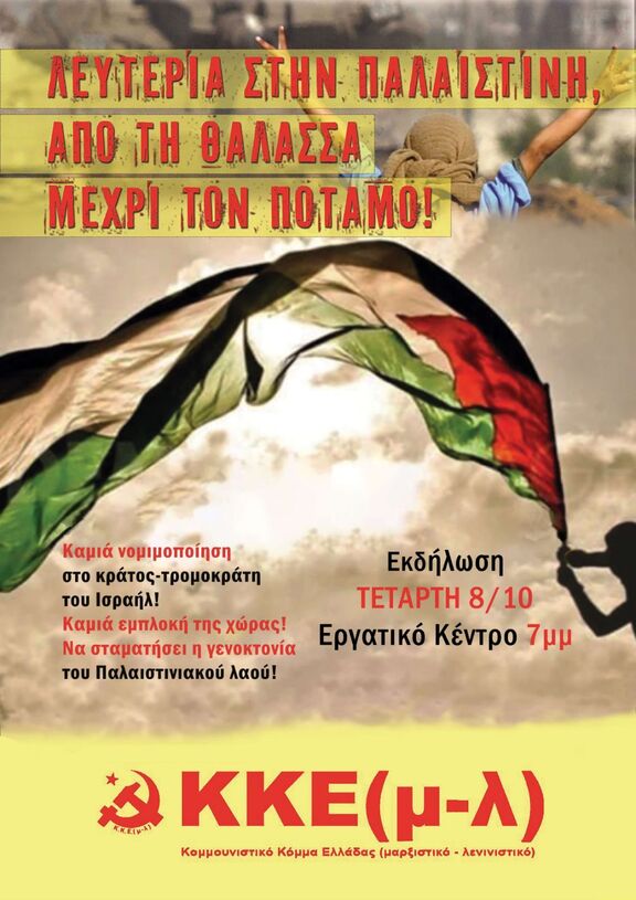 Η Κ.Ο. Χανίων του ΚΚΕ(μ-λ) με αφορμή και τις τελευταίες εξελίξεις διοργανώνει εκδήλωση-συζήτηση για το Παλαιστινιακό ζήτημα, την εμπλοκή της χώρας και το ρόλο των Νατοίκών βάσεων την Τετάρτη 8/10, στις 7μμ στο Εργατικό Κέντρο.