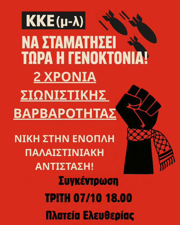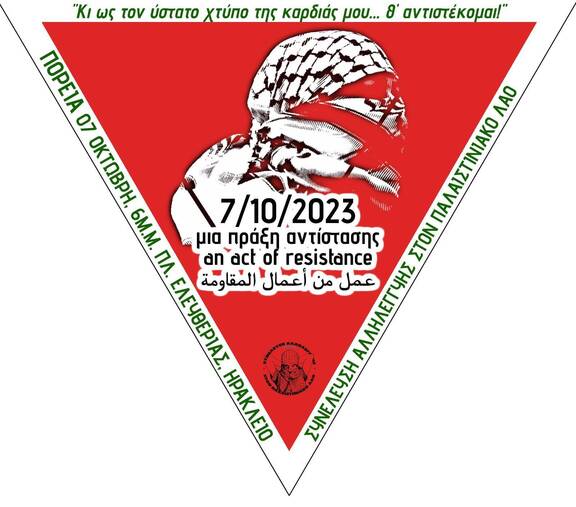 Και σε αυτήν αφιερώνουμε αυτή τη μέρα, την 7η Οκτώβρη του 2025, και σας καλούμε σε συγκέντρωση και πορεία, στην Πλατεία Ελευθερίας στις 18:00. Για να τιμήσουμε αυτούς τους γενναίους ανθρώπους που με αυτοθυσία έχουν σταθεί σαν τον Δαβίδ απέναντι στο Γολιάθ, στο σύγχρονο ολοκληρωτισμό του Ισραήλ και των Δυτικών Κρατών.