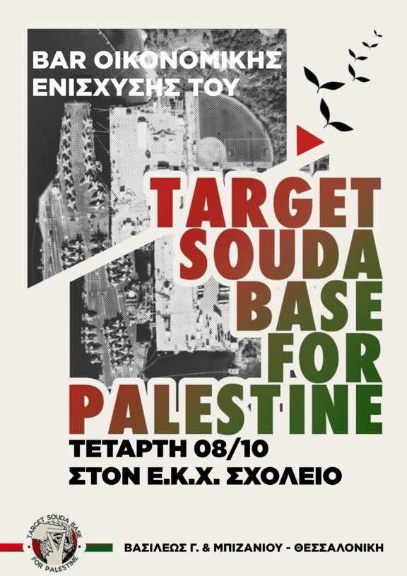 Ο Ελεύθερος Κοινωνικός Χώρος ΣΧΟΛΕΙΟ συμμετέχει στην Πανελλαδική κινητοποίηση ενάντια στη βάση της Σούδας και στη συμμετοχή του ελληνικού κράτους στη γενοκτονία του Παλαιστινιακού λαού.