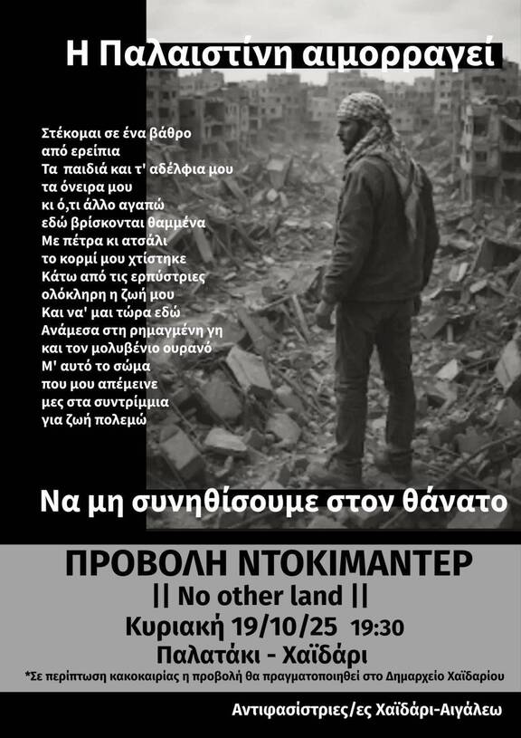 Την Κυριακή 19/10, στις 19:30 σας καλούμε για την Προβολή του ντοκιμαντέρ για την Παλαιστίνη "Καμία Άλλη Γη", στο Παλατάκι Χαϊδαρίου. Διάρκεια ταινίας: 92'