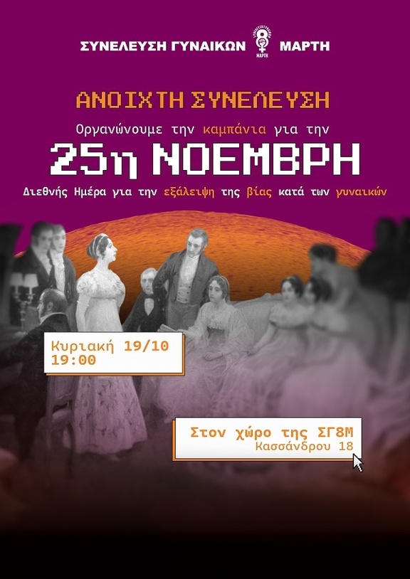 Σας προσκαλούμε στην ανοιχτή μας συνέλευση για την οργάνωση της καμπάνιας της 25ης Νοέμβρη 2025 παγκόσμιας ημέρας για την εξάλειψη της βίας κατά των γυναικών.