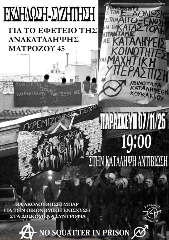 Παρασκευή 7/11 στις 7 μ.μ. θα πραγματοποιηθεί εκδήλωση στην κατάληψη Αντιβίωση με διωκόμενα συντρόφια από την κοινότητα καταλήψεων Κουκακίου ενόψει του εφετείου για την εκκένωση της ανακατάληψης της Ματρόζου 45 που έχει οριστεί για την Τρίτη 2/12.