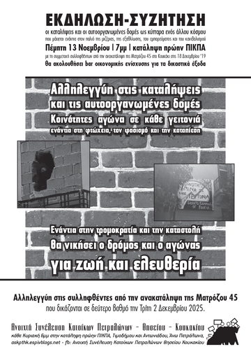 Αλληλεγγύη στους/στις συλληφθέντες/είσες από την ανακατάληψη της Ματρόζου 45 που δικάζονται σε δεύτερο βαθμό στις 2 Δεκεμβρίου 2025.