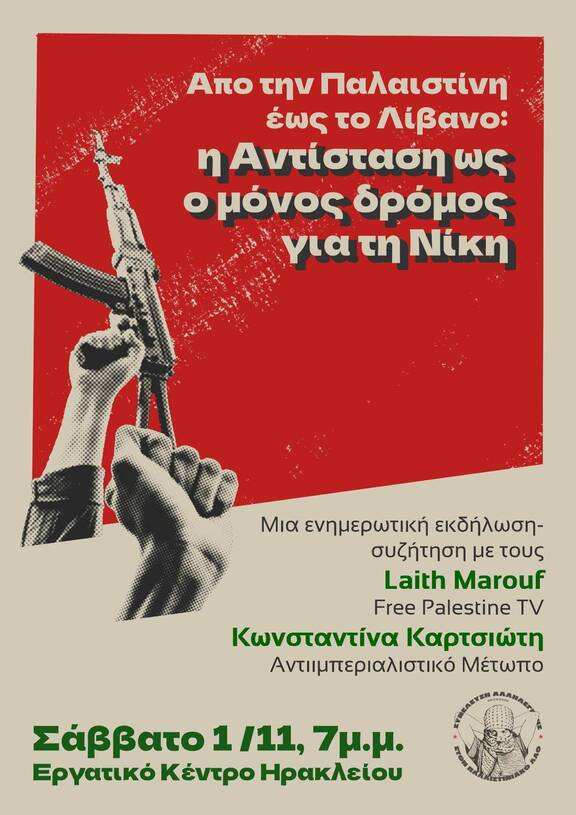 Eνημερωτική Εκδήλωση: Από την Παλαιστίνη ως τον Λίβανο: Η Αντίσταση ως ο μόνος δρόμος για τη Νίκη. Μια Συζήτηση με τους Laith Marouf και Κωνσταντίνα Καρτσιώτη.