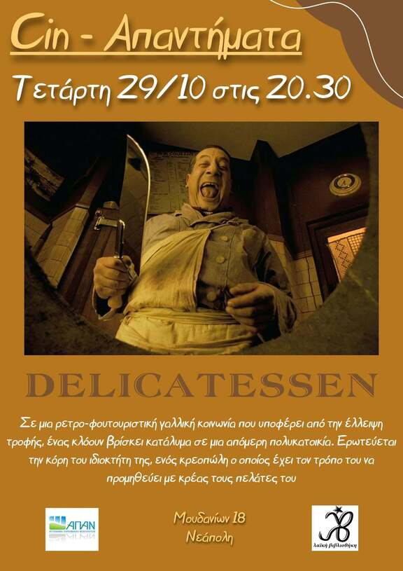 Την Τετάρτη 29 Οκτωβρίου στις 20.30 η προβολή της μαύρης κωμωδίας "Delicatessen" των Ζαν Πιέρ Ζενέ και Μαρκ Καρό.