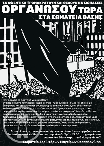 Στα μεροκάματα του τρόμου, χωρίς ένσημα , προσαυξήσεις , δώρα και άδειες, με επισφάλεια και εξουσιαστικές συμπεριφορές απανταμε συλλογικά. Ενάντια στον καθεστωτικό γραφειοκρατικο συνδικαλισμό, επιλέγουμε να οργανωνομαστε στο σωματείο βάσης, όπου όλες και όλοι είμαστε ισότιμες, μακριά από λογικές ανάθεσης, εκπροσώπησης και ιεραρχία. Διεκδικώντας τα αυτονόητα, αλληλέγγυα, είτε δουλεύουμε αποκλειστικά στην εστίαση είτε εποχιακά/παροδικά. Λειτουργούμε μέσα από τακτικές γενικές συνελεύσεις συναποφασίζοντας για την πορεία των διεκδικήσεων μας. Το σωματείο είναι ανοιχτό για κάθε συνάδελφο/ισσα, εκτός από φασίστες, σεξιστές, ομοφοβικούς, ρατσιστές, υπεύθυνους, προϊσταμένους και αφεντικά .