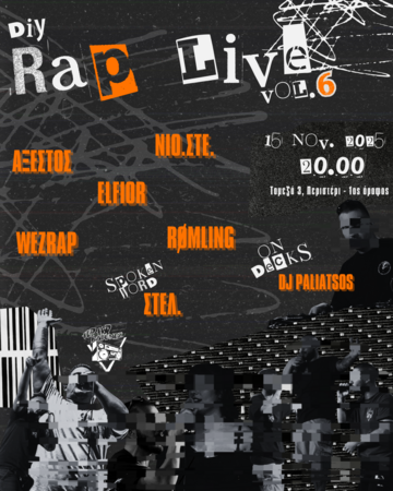 Το Σάββατο 15/11/25 επιστρέφουμε με το 6ο κατά σειρά DIY Rap Live στον αυτοοργάνωμενο χώρο μας! Όπως από τις πρώτες μας εποχές ανοίξαμε μικρόφωνα, και δώσαμε μεγαλύτερη φωνή στο χιπ χοπ μέσα στη γειτονιά μας, έτσι και τώρα σας καλούμε σε ένα ακόμα live καφενειακό!