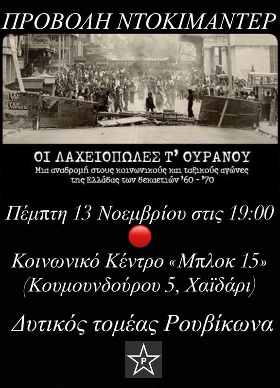 Προβολή του ντοκιμαντέρ - Οι Λαχειοπώλες τ' Ουρανού, την Πέμπτη 13 Νοέμβρη στις 19:00 στο Κοινωνικό Κέντρο "Μπλοκ 15".