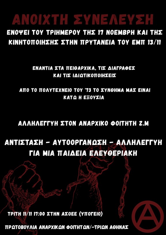 ΑΝΟΙΧΤΗ ΣΥΝΕΛΕΥΣΗ της Πρωτοβουλίας Αναρχικών Φοιτητών/-τριών Αθήνας ενόψει του τριημέρου της 17 Νοέμβρη και της κινητοποίησης στην Πρυτανεία του ΕΜΠ 13/11