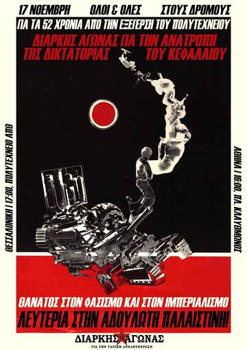 Ο Νοέμβρης μας διδάσκει ότι όσο ισχυρός και αν είναι ο αντίπαλος, οι λαοί όταν οργανώνονται μπορούν να τον ανατρέψουν. Οι οργανωμένοι αγώνες συνεχίζουν να δημιουργούν ρήγματα στην δικτατορία του κεφαλαίου όποια μορφή κι αν παίρνει. Μέσα από τους αγώνες του προλεταριάτου, διδασκόμαστε ότι ο ταξικός και λαϊκός αγώνας καθώς και η διεθνιστική αλληλεγγύη στους λαούς της Μέσης Ανατολής και του Σουδάν που βιώνουν την ιμπεριαλιστική βαρβαρότητα και βρίσκουν το σθένος να αντισταθούν, έχουν τρόπους να εκφραστούν και να εκδηλωθούν ενιαία. Και τους τρόπους αυτούς, μόνο εμείς οι ίδιοι και οι ίδιες, μπορούμε να τους εντοπίσουμε και να τους μετατρέψουμε σε ύλη, σε οργάνωση, σε αγώνα. Το Πολυτεχνείο, όπως και η Παλαιστινιακή και Λιβανέζικη Αντίσταση, αποτελεί το εναρκτήριο έναυσμα για την πυροδότηση ενός αντιιμπεριαλιστικού αγώνα, ενάντια στη βία και την καταπίεση καπιταλισμού - φασισμού - ιμπεριαλισμού. Είναι καθήκον μας να επικαιροποιήσουμε μέσα στην πραγματικότητα που ζούμε την πάλη για "Ψωμί, Παιδεία και Ελευθερία", να βρούμε τις λέξεις και τα σχήματα που θα μπορέσουν να εκφράσουν τις λαϊκές ανάγκες όπως έκαναν τα συνθήματα των πλακάτ εκείνων των ημερών που έγραφαν "Λαέ Χτύπα", "Επανάσταση λαέ", "Απόψε πεθαίνει ο Φασισμός", "Έξω οι ΗΠΑ και το ΝΑΤΟ". Τιμή και μνήμη για τους αγωνιστές και τις αγωνίστριες του Πολυτεχνείου είναι να διδαχθούμε από την πείρα τους, να συνεχίσουμε από εκεί που αυτοί κατάφεραν να φτάσουν, να απαντήσουμε στα ερωτήματα της δικής μας εποχής και να μας βρει αυτή οργανωμένους και αποφασισμένες, να τολμήσουμε να πάμε τα πράγματα ακόμα πιο μπροστά.