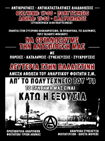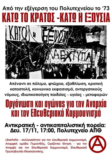 Καλούμε όλους και όλες στην πορεία για την επέτειο της εξέγερσης του Πολυτεχνείου, όπου θα σχηματίσουμε κοινό αναρχικό μπλοκ με τους συντρόφους και τις συντρόφισσες της Ελευθεριακής Πρωτοβουλίας Θεσσαλονίκης, της Libertatia - Συλλογικότητας για τον Ελευθεριακό Κομμουνισμό και της Αναρχικής Ομάδας Πυρανθός.