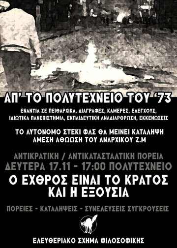 Ο Νοέμβρης του '73 δεν αποτελεί ούτε εθιμοτυπική γιορτή τηςαστικής δημοκρατίας ούτε γενέθλια επέτειο αποκατάστασης τουπολιτεύματος , όπως οι επαΐοντες της σύγχρονης εξουσίαςπασχίζουν να μας διδάξουν. Ο Νοέμβρης του '73 αποτέλεσετομή και κοινωνική αποτύπωση του αναρχικού αγώνα και έθεσετην επαναστατική προοπτική του κόσμου μας, αφήνονταςανεξίτηλη ιστορική παρακαταθήκη για τους αγωνιστές τουσήμερα. Όσο κατά την εξέγερση και ύστερα κατά τηνμεταπολίτευση η αριστερή μπάντα εξουσίας προσπαθούσε νααφομοιώσει στους κόλπους της τα γεγονότα του Πολυτεχνείου, υπό το πρίσμα του αντιδικτατορικού αγώνα, οι αναρχικοί έθετανένα σαφές πρόταγμα: «Κάτω η εξουσία» - ενάντια σε κάθεκράτος, καπιταλισμό και δημοκρατία.