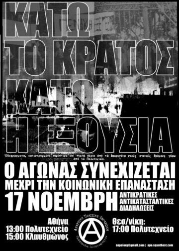 Για τον λόγο αυτό, μόνο μέσω της συλλογικής οργάνωσης στηβάση και της συντονισμένης αναρχικής παρέμβασης είναιδυνατόν να αντιμετωπίσουμε την κρατική καταστολή και ναανατρέψουμε το υπάρχον σύστημα. Όσο λοιπόν κ' ανπροσπαθούν να μας θέσουν στο περιθώριο, να μαςτρομοκρατήσουν, να καταστείλουν τους αγώνες μας και ναποινικοποιήσουν την δράση μας, εμείς θα βρισκόμαστε πάνταστον αντίποδα των κρατικών προσταγμάτων - δίνοντας τηνυπόσχεση ότι ο αγώνας μας δεν υποχωρεί, αλλά μάχεται καιαντιστέκεται. Από το Πολυτεχνείο του '73 κρατάμε την σπίθατης εξέγερσης ζωντανή και ανάβουμε την φλόγα για τηνεπικείμενη ανατροπή της εξουσίας μέσα από τον οργανωμένο, μαζικό και ακηδεμόνευτο αγώνα. Με όπλο την αλληλεγγύη καιτην αυτοοργάνωση, αποδεικνύουμε πως οι εξεγέρσεις δεν είναιουτοπία και χαράζουμε τον δρόμο προς την ολική συντριβή τηςεξουσίας, την κατεδάφιση του αστικό-δημοκρατικού συρφετού. Τον δρόμο προς την εξέγερση και την κοινωνική απελευθέρωση- τον δρόμο προς την Αναρχία.