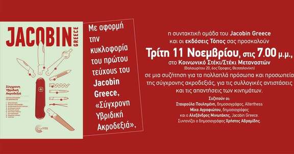 Mε αφορμή την κυκλοφορία του πρώτου τεύχους του Jacobin Greece,«Σύγχρονη Υβριδική Ακροδεξιά», η συντακτική ομάδα του Jacobin Greece και οι εκδόσεις Τόπος σας προσκαλούν τη Τρίτη 11 Νοεμβρίου στο φιλόξενο Κοινωνικό Κέντρο / Στέκι Μεταναστών (Βαλαωρίτου 20, 6ος Όροφος) σε μια συζήτηση για τα πολλαπλά πρόσωπα και προσωπεία της σύγχρονης ακροδεξιάς, για τις συλλογικές αντιστάσεις και τις απαντήσεις των κινημάτων.