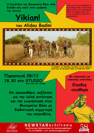 Η κοινότητα της Μπουρκίνα Φάσο στην Ελλάδα σας καλεί στην προβολή της ταινίας «Yikian!» του Alidou Badini. Η ταινία αναφέρεται στην αντίσταση του λαού της Μπουρκίνα Φάσο απέναντι στην τρομοκρατία. Όπως είπε και ο σκηνοθέτης: «Με αυτή την ταινία θέλησα να συνεισφέρω στην ενότητα στην μάχη ενάντια στην τρομοκρατία. Είναι ένα κάλεσμα προς τους νέους να έρθουν κοντά και να οργανωθούν.»