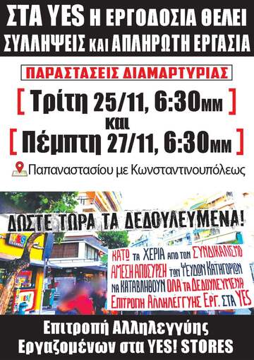 Στα YES!STORES η εργοδοσία θέλει ΣΥΛΛΗΨΕΙΣ και ΑΠΛΗΡΩΤΗ ΕΡΓΑΣΊΑ!