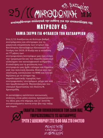 Στις 2/12 δικάζονται σε δεύτερο βαθμό συντρόφισσες και σύντροφοι για τη μαχητική υπεράσπιση των κτιρίων της κοινότητα καταλήψεων Κουκακίου το Γενάρη του 2020. Η δίωξη και η καταδίκη σε 77 μήνες των συντροφισσών/συντρόφων μας έχει στόχο την τρομοκρατία και τον παραδειγματισμό ολόκληρου του καταληψιακού κινήματος. Η απαίτηση για τη φυλάκιση των συντροφιών μας ήρθε επίσημα και δημόσια από την πολιτική εξουσία. Πλάνα από την εκκένωση κατέκλυσαν τα ΜΜΕ και έγιναν δηλώσεις με το αίτημα της παραδειγματικής τιμωρίας των συντροφισσών/συντρόφων, μέχρι και από τον πρωθυπουργό Κ. Μητσοτάκη και τον υπουργό προστασίας του Πολίτη Μ. Χρυσοχοΐδη.