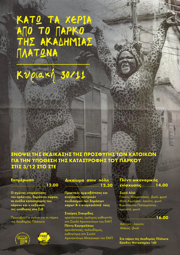 Εκδήλωση για το πάρκο της Ακ. Πλάτωνα ενόψει της εκδίκασης της προσφυγής των κατοίκων για την υπόθεση της καταστροφής του πάρκου από το δήμο Αθηναίων και το υπουργείο πολιτισμού στις 3/12 στο Συμβούλιο της Επικρατείας.