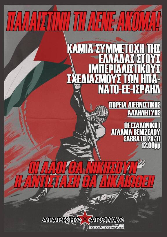 Στην χώρα μας, κυβέρνηση Μητσοτάκη φροντίζει να δίνει διαρκώς διαπιστευτήρια για την άνευ όρων στήριξη της στο σιωνιστικό Ισραήλ και τις ΗΠΑ. Η κυβέρνηση του ΟΠΕΚΕΠΕ, του εγκλήματος των Τεμπών της ακρίβειας και του πολέμου δεν χάνει καμία ευκαιρία για να καταστείλει και να τρομοκρατήσει όποιον στέκεται αλληλέγγυος στο Παλαιστινιακό λαό και ενάντια στο κράτος- δολοφόνο του Ισραήλ και τα φιλοπόλεμα σχέδια της. Όργιο καταστολής στη μαζική διαδήλωση στις 7/10, διώξεις συνδικαλιστών και αγωνιστών, απαγόρευση όλων των δημόσιων συγκεντρώσεων με αφορμή την επίσκεψη του Ζελένσκι, κλίμα αστυνομοκρατίας στη αντιιμπεριαλιστική διαδήλωση της 17 Νοέμβρη: μόνο αυτά τα μέσα έχουν παραμείνει σε ένα καθεστώς που παραπαίει από την παρακμή, τα σκάνδαλα και την κοινωνική απονομιμοποίηση.