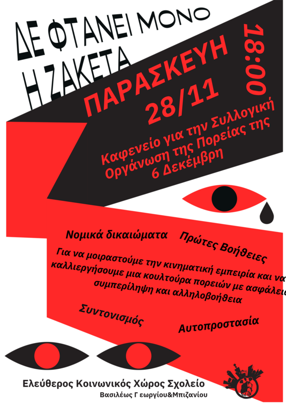 Σαν Ελεύθερος Κοινωνικός Χώρος Σχολείο έχοντας κάνει την παραπάνω ανάγνωση θέλουμε να μοιραστούμε την κινηματική γνώση και εμπειρία και να καλλιεργήσουμε μια κουλτούρα ασφάλειας, συμπερίληψης και αλληλοβοήθειας στις πορείες ώστε αυτές να κοινωνικοποιούνται όσο γίνεται περισσότερο. Έτσι διοργανώνουμε ένα καφενείο ώστε σε χαλαρό πλαίσιο να συζητήσουμε για το πως συμμετέχουμε σε πορείες και ιδιαίτερα στην 6 Δεκέμβρη με ενδεικτικές θεματικές τα νομικά μας δικαιώματα, τις πρώτες βοήθειες, τα μέσα αυτοπροστασίας, τον συντονισμό και την ασφάλεια μεταξύ μας . Κάθε άλλη ανησυχία είναι ευπρόσδεκτη!