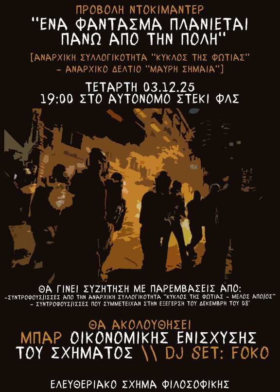 Μετά την προβολή και συζητηση εν όψει 6 Δεκέμβρη θα ακολουθήσει BAR με Dj set Foko για την οικονομική ενίσχυση του σχήματος