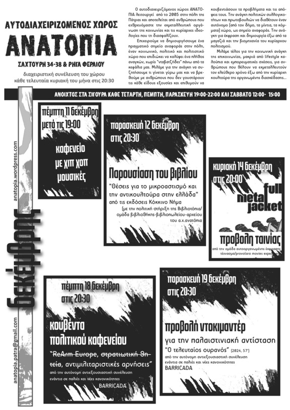 πρόγραμμα εκδηλώσεων Δεκέμβρη στον αυτοδιαχειριζόμενο χώρο ΑΝΑΤόΠΙΑ