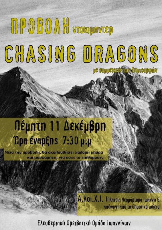 Την Πέμπτη 11 Δεκεμβρίου 2025 στις 19:30, η Ελευθεριακή Ορειβατική Ομάδα Ιωαννίνων σας προσκαλεί στο χώρο του Α.Κοι.Χ.Ι στα Γιάννενα για μία μοναδική προβολή (ενόψει εορτασμού της Παγκόσμιας Ημέρας του Βουνού) του ντοκιμαντέρ Chasing Dragons παρουσία ενός εκ των συντελεστών.