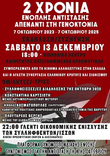 Η 7η Οκτώβρη του 2023 αποτέλεσε το σημείο καμπής στην κλιμάκωση της ιμπεριαλιστικής - γενοκτονικής βαρβαρότητας του γενοκτονικού σιωνιστικού κράτους του Ισραήλ και των συμμάχων του (ΗΠΑ, ΝΑΤΟ), με το ελληνικό κράτος να παίρνει ενεργό ρόλο στη γενοκτονία (νατοϊκές βάσεις, αποστολή πολεμικού υλικού, προπαγάνδα, εγχώρια καταστολή του κινήματος αλληλεγγύης), εμπλέκοντας τον λαό ολοένα και περισσότερο στη μεριά του άξονα ΗΠΑ - ΝΑΤΟ - ΕΕ στον Τρίτο Παγκόσμιο Πόλεμο. Αποτέλεσε, όμως, και μια ημερομηνία - σταθμό του παγκόσμιου και εγχώριου κοινωνικού ταξικού λαϊκού αντιιμπεριαλιστικού διεθνιστικού κινήματος αλληλεγγύης, το οποίο πήρε θέση ενάντια στο κράτος του Ισραήλ, υπερασπιζόμενο το δικαίωμα των λαών στην αυτοδιάθεση, την ελευθερία και την αντίσταση στις ιμπεριαλιστικές σφαγές.