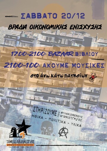 Bazaar βιβλίου θα πραγματοποιηθεί το Σάββατο 20/12 από τις 17:00 στην Κατάληψη Ανω κάτω Πατησίων και θα ακολουθήσει bar από τις 18:00-1:00 για την οικονομική ενίσχυση του Ταμείου.