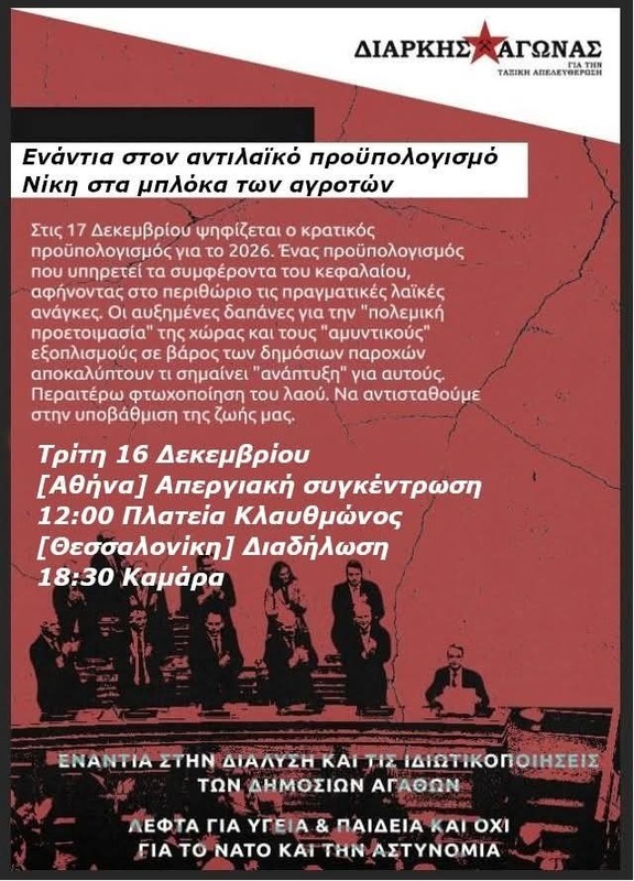 ΚΑΛΕΣΜΑ ΤΟΥ ΔΙΑΡΚΗ ΑΓΩΝΑ ΣΤΙΣ ΚΙΝΗΤΟΠΟΙΗΣΕΙΣ ΕΝΑΝΤΙΑ ΣΤHN ΨΗΦΙΣΗ ΤΟΥ ΑΝΤΙΛΑΪΚΟΥ ΚΡΑΤΙΚΟΥ ΠΡΟΫΠΟΛΟΓΙΣΜΟΥ & ΣΤΗΡΙΞΗΣ ΤΟΥ ΑΓΩΝΑ ΤΩΝ ΑΓΡΟΚΤΗΝΟΤΡΟΦΩΝ