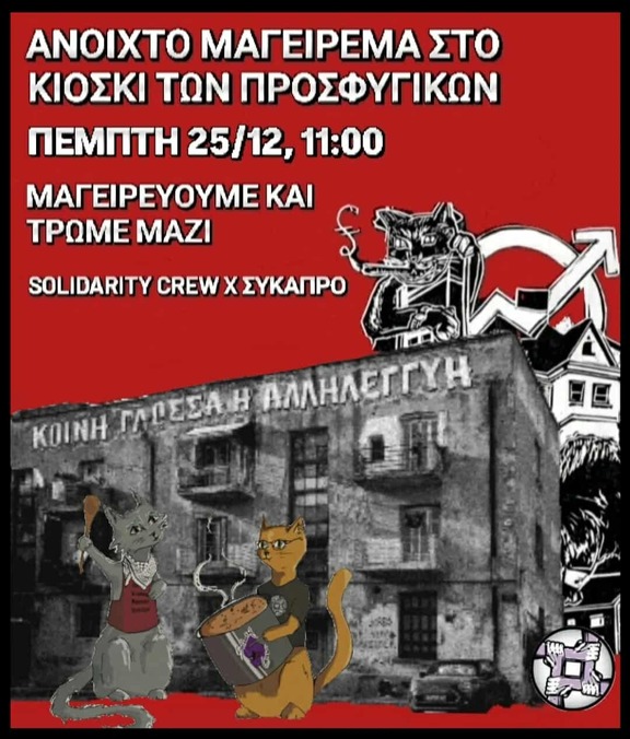 Όπως κάθε Χριστούγεννα, έτσι κι φέτος, Πέμπτη 25 Δεκέμβρη από τις 11:00 το πρωί, θα βρισκόμαστε στο κιόσκι της κοινότητας των Κατειλημμένων Προσφυγικών, στη λεωφόρο Αλεξάνδρας για το ανοιχτό μας μαγείρεμα.