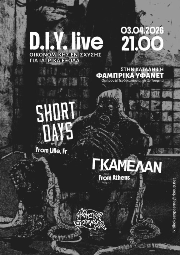 Παρασκευή 03/04, στις 21:00, στην κατάληψη Φάμπρικα Υφανέτ, η punk συναυλιακή ομάδα Ηχητικό Ξέσπασμα, διοργανώνει D.I.Y. live με τη συμμετοχή των: