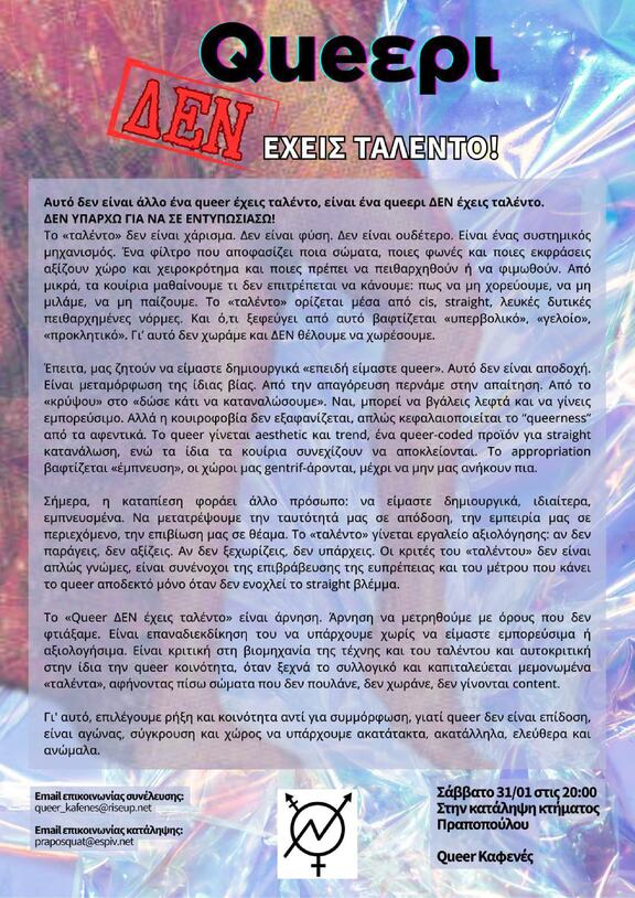 Το «Queer ΔΕΝ έχεις ταλέντο» είναι άρνηση. Άρνηση να μετρηθούμε με όρους που δεν φτιάξαμε. Είναι επαναδιεκδίκηση του να υπάρχουμε χωρίς να είμαστε εμπορεύσιμα ή αξιολογήσιμα. Είναι κριτική στη βιομηχανία της τέχνης και του ταλέντου και αυτοκριτική στην ίδια την queer κοινότητα, όταν ξεχνά το συλλογικό και καπιταλεύεται μεμονωμένα «ταλέντα», αφήνοντας πίσω σώματα που δεν πουλάνε, δεν χωράνε, δεν γίνονται content.