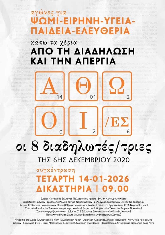ΟΛΟΙ/ΕΣ 14 ΓΕΝΑΡΗ, 9ΠΜ, ΔΙΚΑΣΤΗΡΙΑ ΧΑΝΙΩΝ! ΝΑ ΑΘΩΩΘΟΥΝ ΟΙ 8 ΔΙΑΔΗΛΩΤΕΣ ΤΗΣ 6ΗΣ ΔΕΚΕΜΒΡΗ 2020!