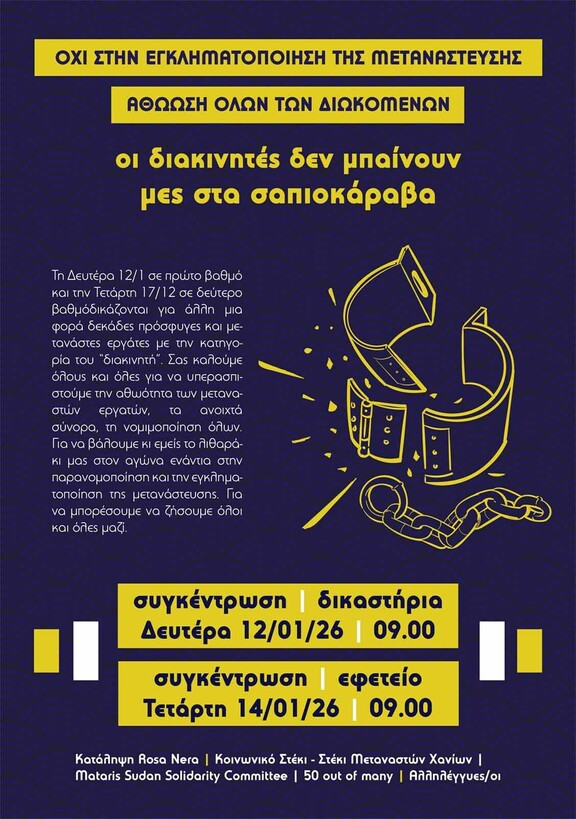 Δίκες μεταναστών ως "διακινητών"- Συγκέντρωση αλληλεγγύης στα δικαστήρια - Δευτέρα 12/1 και Τετάρτη 14/1, 9 π.μ. [Kατάληψη Rosa Nera | Kοινωνικό στέκι-Στέκι μεταναστών Χανίων | Mataris Sudan solidarity commitee | 50 out of many | αλληλέγγυες/ αλληλέγγυοι]